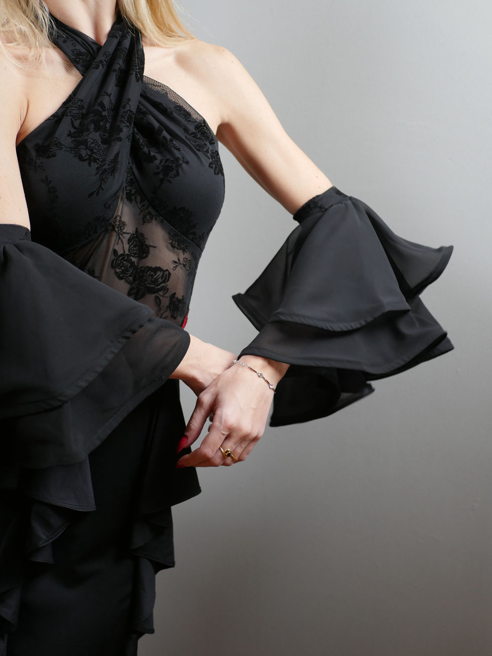 Add drama and elegance to every movement with the Fiery Sleeves, crafted from lightweight, flowing chiffon that amplifies every turn and gesture. Their airy layers and deep black hue create a striking balance of sophistication and freedom. Perfect for Latin, ballroom, or show dancers, they effortlessly attach to any top to bring power, flair, and expression to your performance.